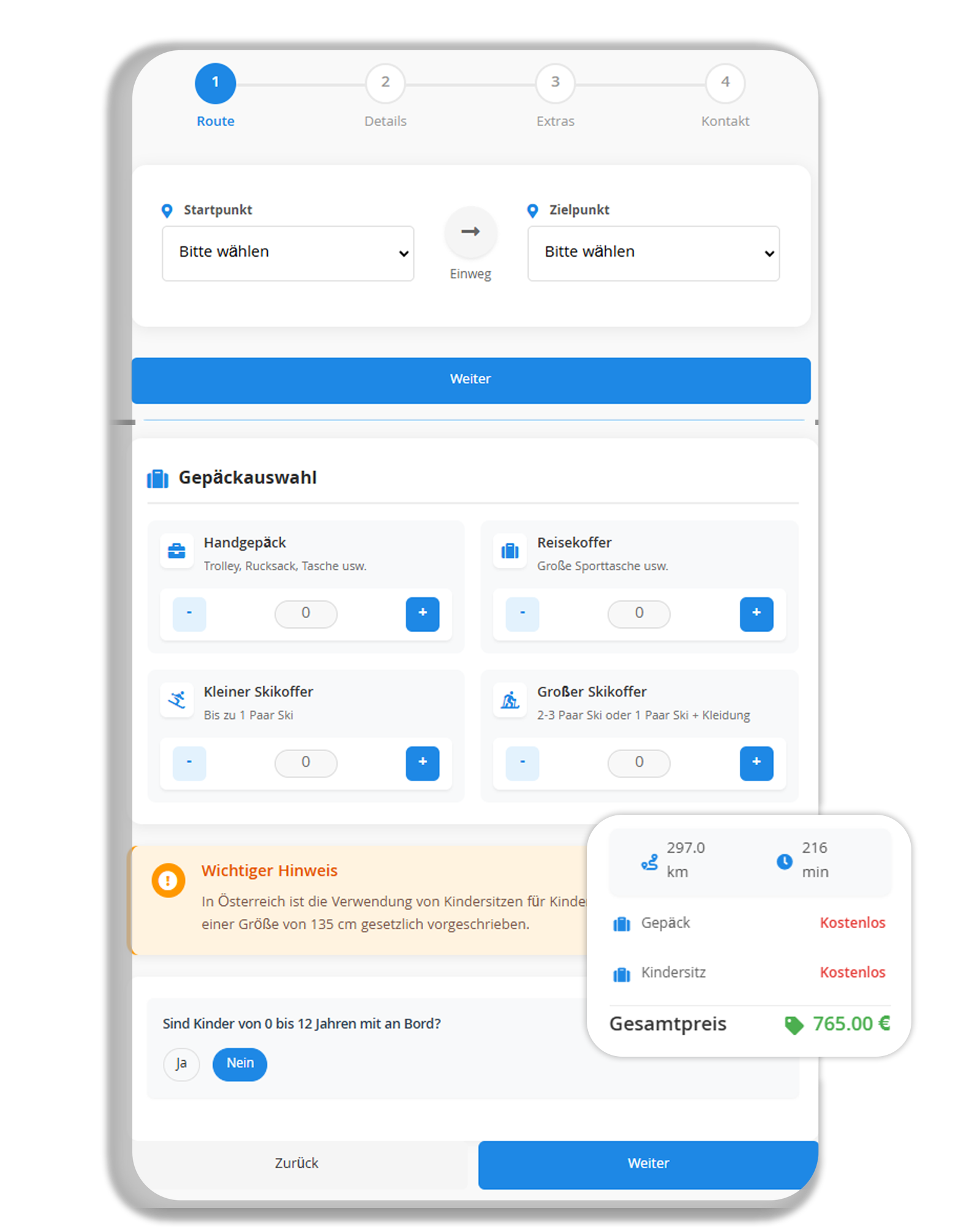 Mit unserem benutzerfreundlichen Buchungssystem sichern Sie sich Ihre Taxifahrt schnell und unkompliziert. Geben Sie Ihre Daten ein, bestätigen Sie den Preis und genießen Sie eine stressfreie Fahrt!